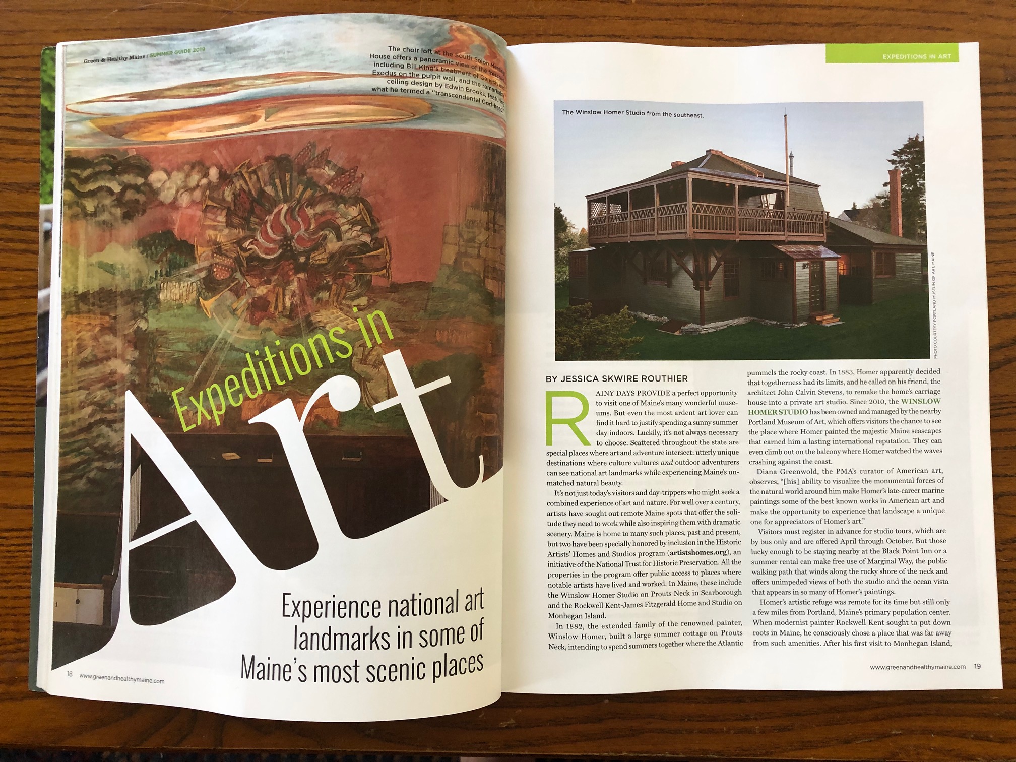My story this year fits the overall theme of “Off the Beaten Track” and focuses on nationally significant art landmarks that are in some of Maine’s most beautiful and tucked-away places: Winslow Homer’s studio on Prouts Neck, the Rockwell Kent/James Fitzgerald home and studio on Monhegan, the Olson House (of Christina’s World) and the Langlais Sculpture Preserve in Cushing, and more.